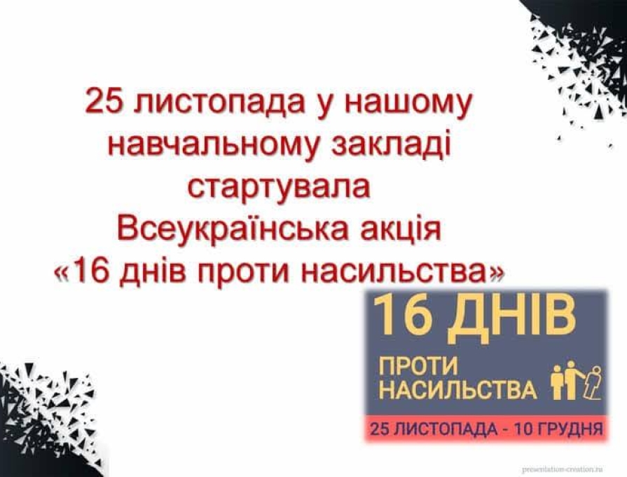 Щорічно з 25 листопада до 10 грудня проводиться Всеукраїнська кампанія «16 днів проти насильства» з метою привернення уваги до проблем подолання насильства в сім'ях, жорстокого поводження з дітьми, протидії торгівлі людьми та захисту прав жінок.